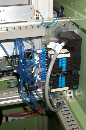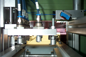 Assuming the timer passes the cosmetic check the timer then passes to the functional check area.The meter is first held in place from above by the plunger plate that is lowered using a pneumatic cylinder.Once this is in place a second pneumatic cylinder below the timer raises a contact block on to the electrical contacts on the rear of the timer. This provides power for the timer and monitors the outputs from the heating and water relay contacts.