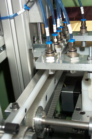 A set of pneumatically controlled plungers press the buttons on the timer in accordance with the script.
