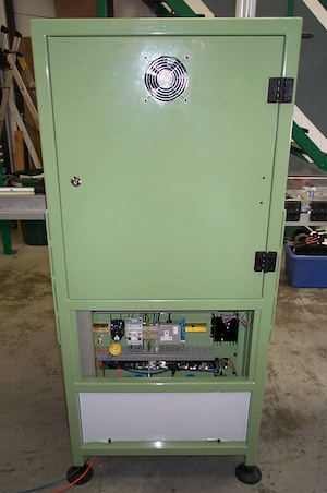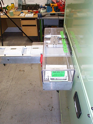 If the timer fails any of the tests it is placed into the output chute and a fail ticket is printed by a small printer in the side of the machine.If either the output of reject chute gets full the system automatically stops and a warning traffic light on the top of the system flashes.